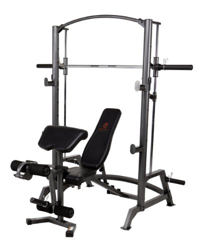 Looking for an all in one exercise machine for home? Want to combine the safety of a "Smith" machine yet still be able to perform true bench presses? Well look no further than the Marcy SM4008 from Impex Fitness. Built of oversized 14 gauge large square tubing steel, this machine combines the best of both worlds while helping you increase muscle mass, strength and stamina. The "Smith" style press bar with adjustable safety stops is safer than conventional free-weight stacks. Think of it as your built in spotter. Bench presses can be utilized with the included adjustable utility bench and the "outside the frame" bar catches. Just grab your Olympic weight set and your good to go. Also included in this full featured home gym is an independent motion upper pulley system for cable crossovers. A variety of exercises can be performed with these for total upper body training. Use the independent motion butterfly to target your chest development. The independent cable system is comprised of nylon pulleys reinforced with sealed bearings, 1" chrome guide rods, and steel "aircraft" cables rated at 2000lb. tensile strength. Target your back and shoulders with the low pulley foot plate. Sit on the floor, press your feet to the foot plate and perform seated rows. The multi-position seat and back pad on the utility bench adjusts to incline, flat and decline chest press positions. For extended life, the seat and back pad are constructed of boxed upholstery with high density foam. The total leg developer allows you to focus on strengthening and toning your quadriceps, hamstrings and glute muscles. A chin up bar is included for a variety of pull ups and chin ups. Two Olympic weight plate storage posts can be found on either side of the machines frame. A two year limited manufacturer's warranty is included. (Weight plates are required for adding resistance on the "Smith" bar, cable crossovers, butterfly and leg developer. Weight plates are not included.)